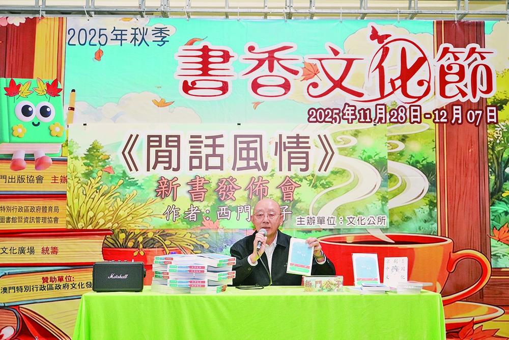 新書發佈會昨日下午四時假塔石體育館二〇二五秋季書香文化節展場舉行,由文化公所主辦,中聯辦宣文部副部長殷汝濤、文化局長梁惠敏、澳門文化界聯合總會副會長穆欣欣、澳門文教出版協會會長林發欽、澳門筆會會長湯梅笑等嘉賓到場支持。