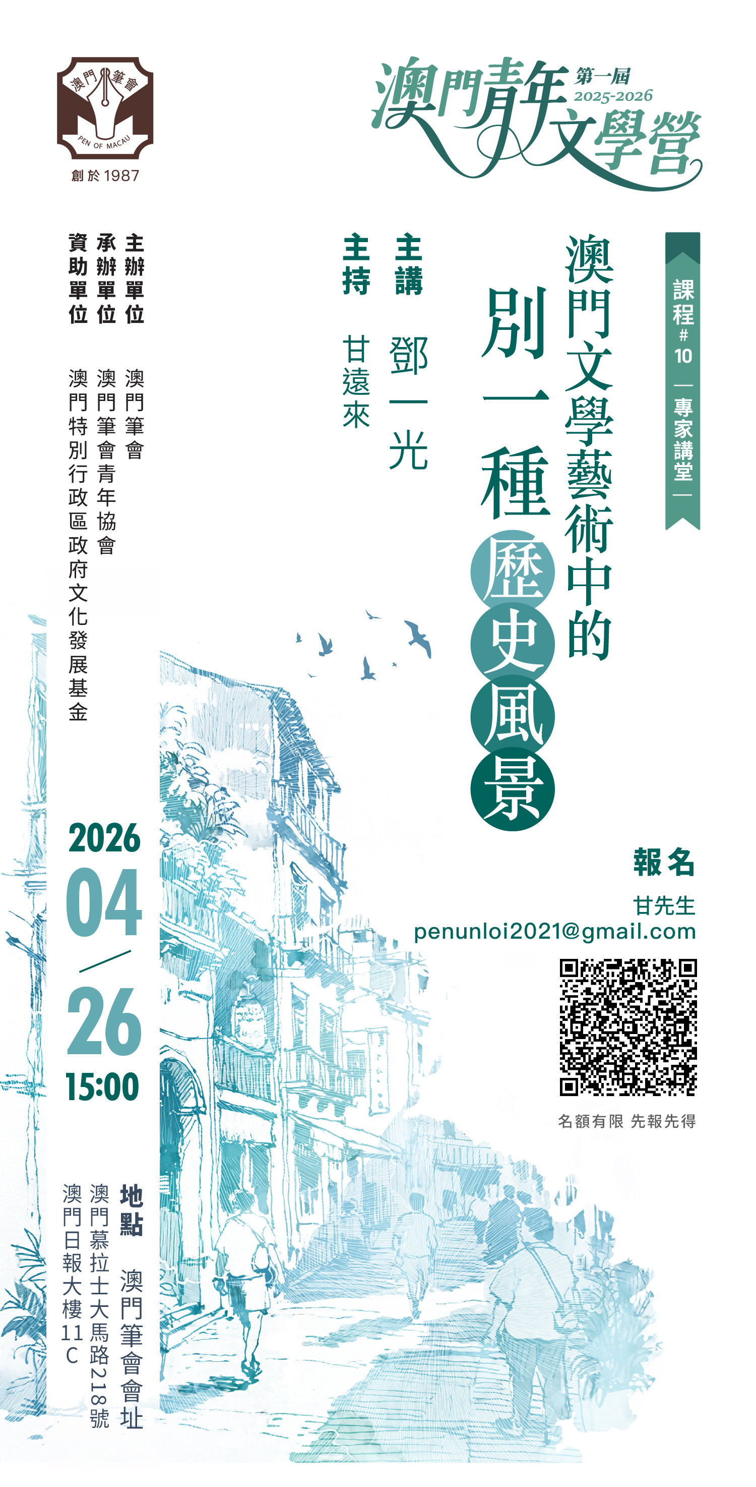由澳門筆會主辦的第一屆澳門青年文學營,將於四月廿六日下午三時於澳門筆會會址舉行第十期專家工作坊,邀請內地著名作家鄧一光主講“澳門文學藝術中的別一種歷史風景”,工作坊借兩位歷史人物和一個歷史事件,談談澳門在中國的世界性建立中的幾個片段,以及澳門文學題材的多樣性和豐富性,歡迎廣大文藝愛好者報名參與。