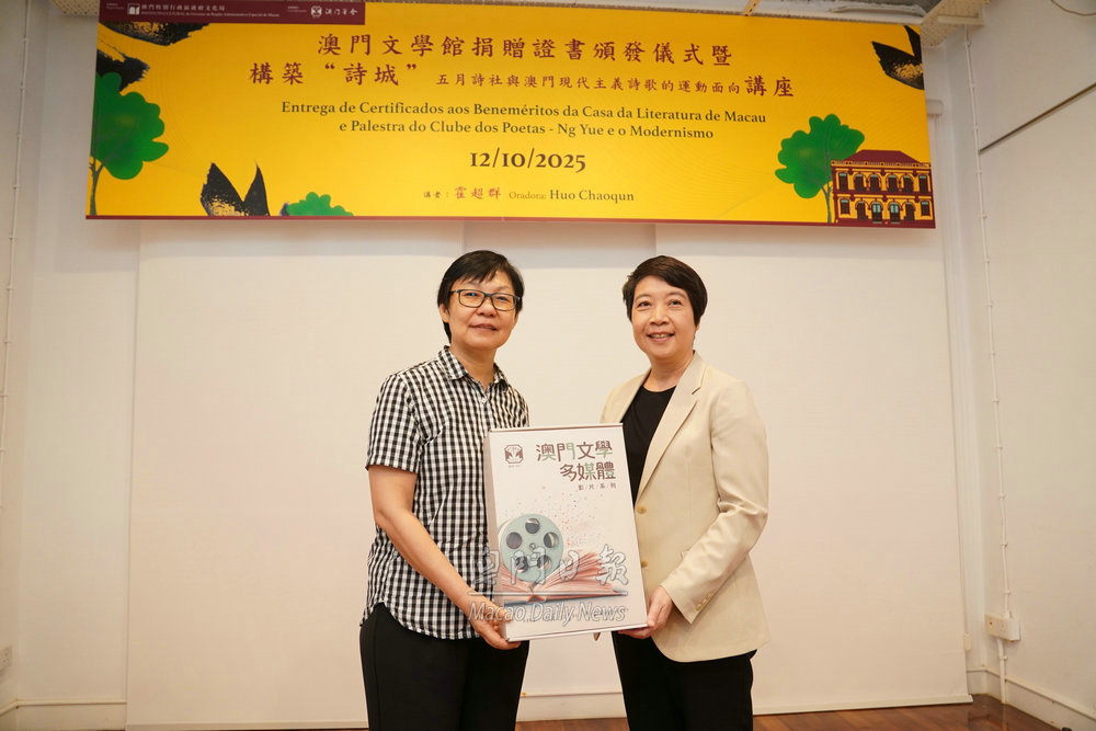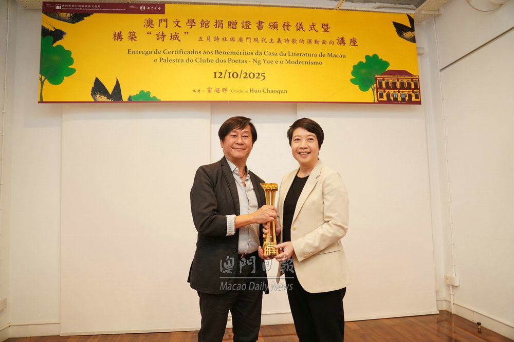 澳门文学馆与澳门笔会合办的“构筑诗城——五月诗社与澳门现代主义诗歌的运动面向”讲座昨举行,澳门笔会会长汤梅笑、理事长廖子馨与资深戏剧家李宇樑同场向文学馆分别捐赠由笔会歷年製作的“澳门文学多媒体系列影片”与曹禺戏剧文学奖奖座,由局长梁惠敏代表接收。