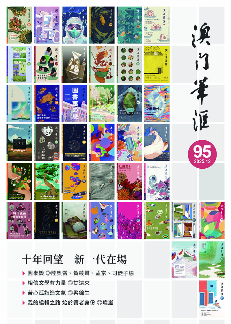 由澳门笔会出版的文学杂志《澳门笔汇》第九十五期已正式出版。本期以“十年回望,新一代在场”为专题,邀请十位活跃于澳门文学场域的编辑与文学活动策划者,从以《澳门笔汇》改版十周年为出发点,讨论当下的澳门文学发展。陆奥雷、贺绫声、孟京、甘远来、司徒子榆、梁锦生、玮岚、李宜聪、李嘉瑶、郑凯山分别以编辑、策划人与设计师的身份切入,分享他们作为新一代文学工作者的经验与感悟,并思考如何在各自的岗位上,肩负起传承与推动本地文学的责任。